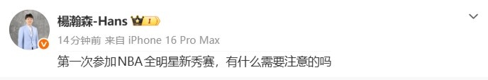 杨瀚森更新个人微博写道:“第一次参加NBA全明星新秀赛,有什么需要注意的吗?”