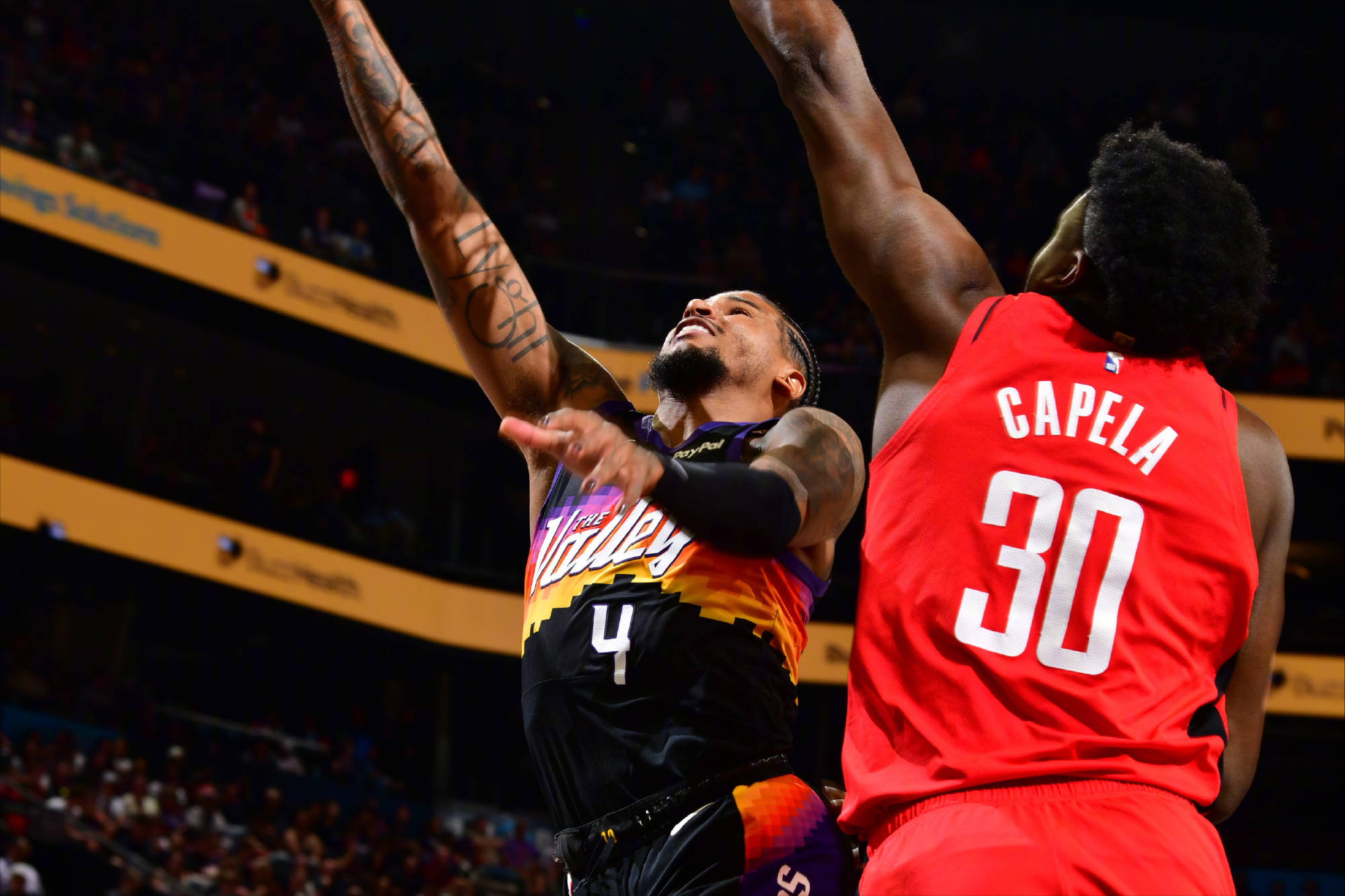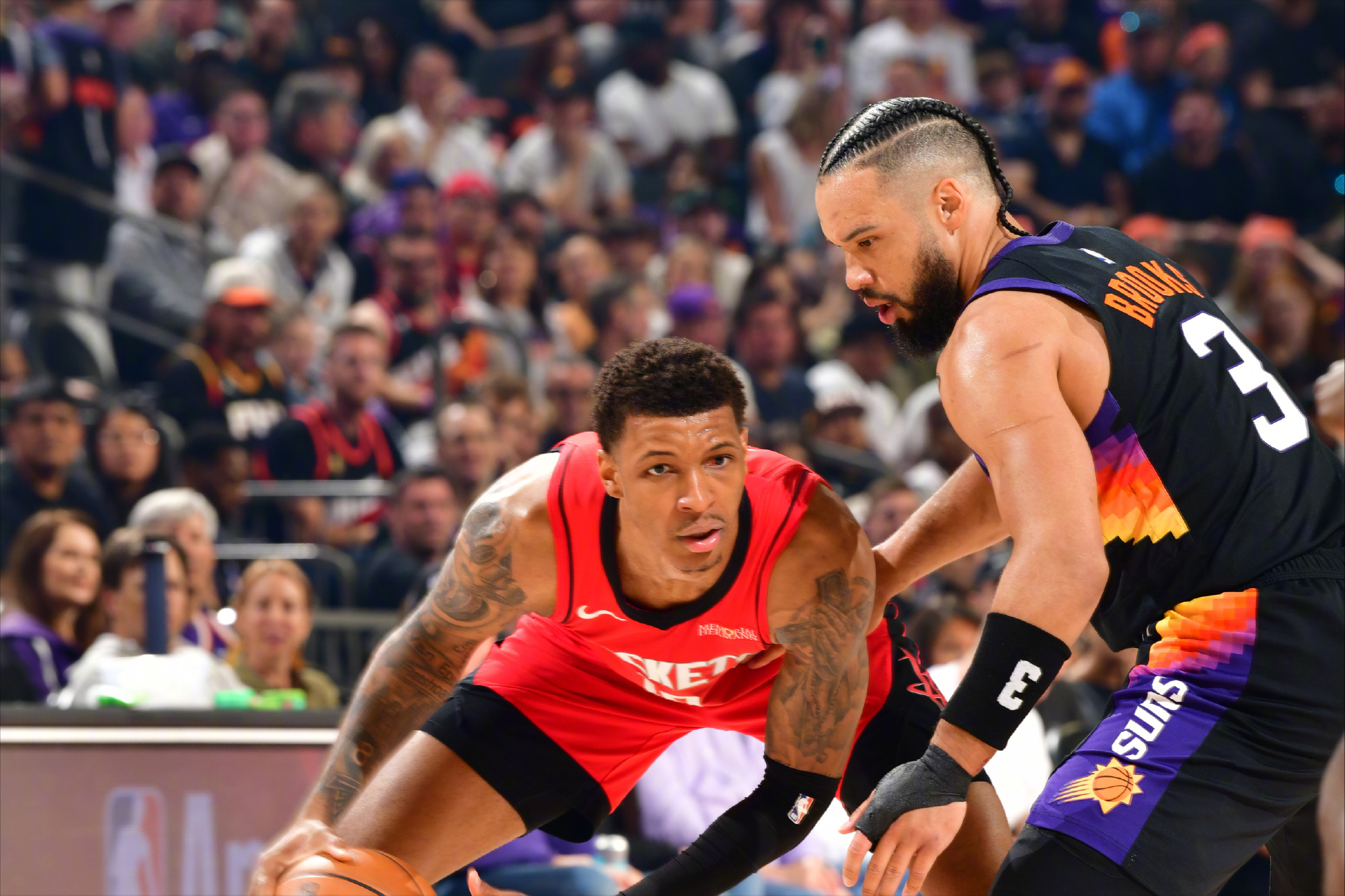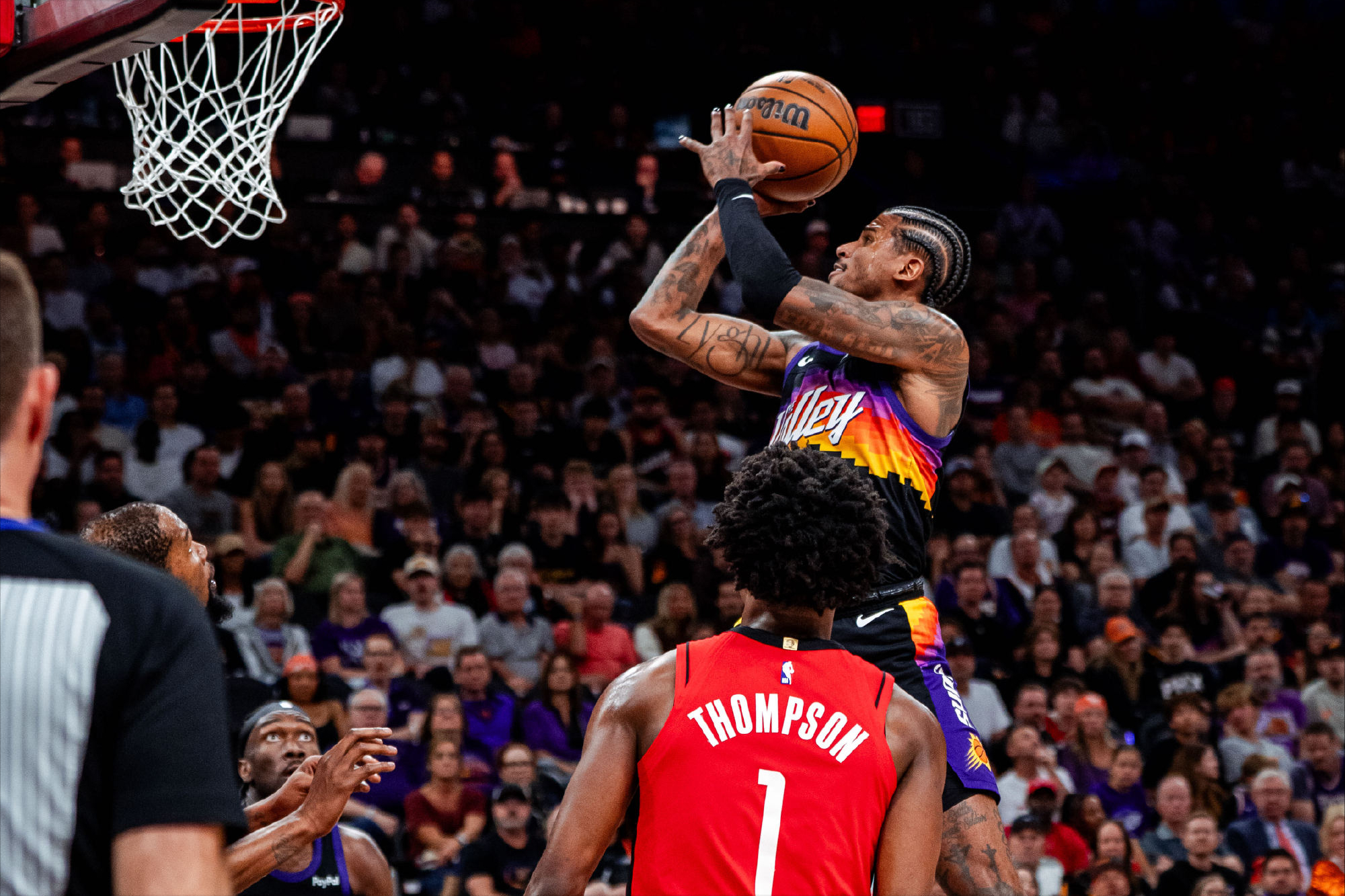 比赛刚开始,火箭队的表现只能用极其糟糕来形容。太阳队手感滚烫,打出了队史自有每回合得分统计以来最强的24-0进攻高潮。全队前15次出手命中10次,前2分钟火箭队在打出5-2领先3分后,后面接近5分钟的时间,火箭队一分未得,而太阳队得到了24分,直接领先21分!而这段时间,火箭队的13次出手只命中2球!次节比赛,火箭队开始调整,首先就是防守端,成功将太阳队的命中率限制在25%。与此同时,进攻端拿到了太阳队首节的剧本,单节三分9投6中,这一节太阳队旧将杜兰特独得11分,帮助球队在半场结束时将分差缩小到3分!